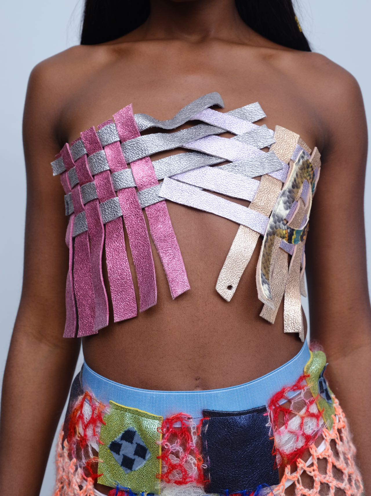 Every garment pulses with raw invention: sculptural silhouettes, unexpected seams, kinetic layering. Handwoven crochet, machine-knitted textures, and deconstructed jersey converge into a vocabulary that never sought conformity — only awakening.
